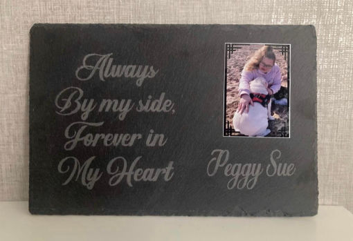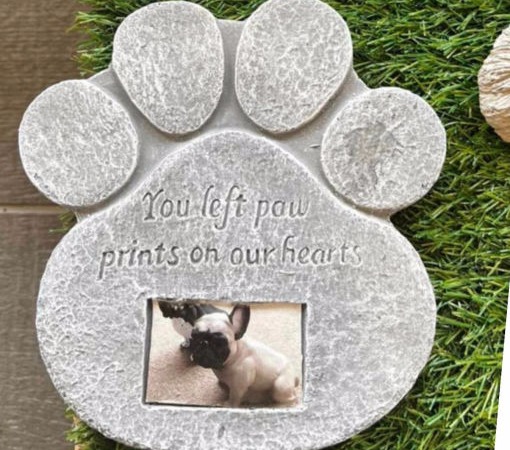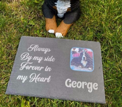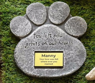 We also offer paw stands and plaques, which can be used as beautiful memorial pieces for your beloved pets. We can supply plain paw stands, and personalised pieces with a photo and a message engraved. These come in stone or slate, and we can tailor these to your requirements. Small paw prints are £15, and large slates are £25. For more information, just ask and we can discus your needs.